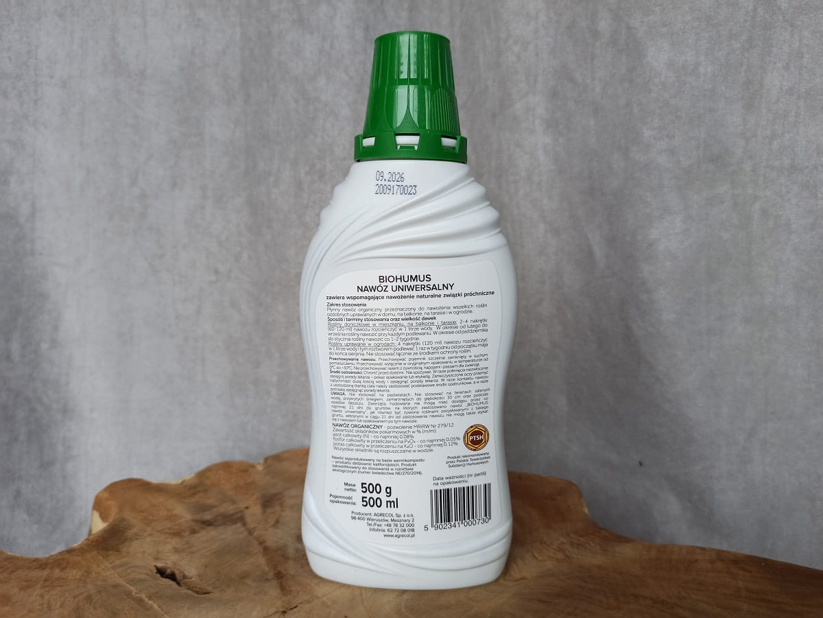 Biohumus nawóz uniwersalny to płynny nawóz organiczny. Przeznaczony do nawożenia wszelkich roślin ozdobnych uprawianych w domu, na balkonie, na tarasie i w ogrodzie. Nawóz powstaje w wyniku przetworzenia substancji organicznej przez dżdżownice kalifornijskie. Nawóz ten jest zakwalifikowany do stosowania w uprawach ekologicznych. Pełnowartościowy skład wzbogaca podłoże oraz poprawia jego strukturę, dzięki czemu rośliny mają zapewnione doskonałe warunki wzrostu i rozwoju. Nawóz ten jest zakwalifikowany do stosowania w uprawach ekologicznych.