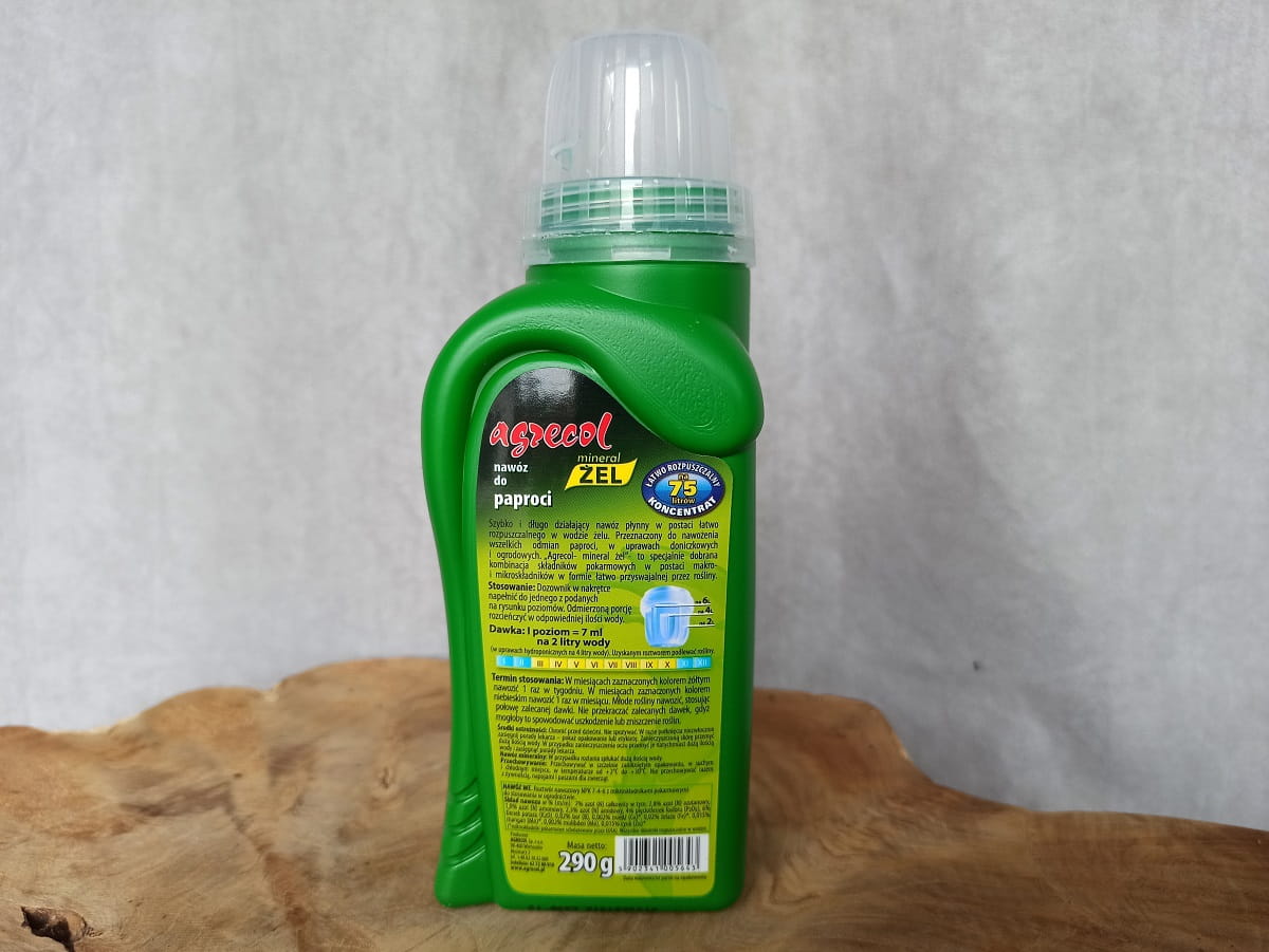 Nawóz do paproci z serii Mineral żel to płynny nawóz mineralny w postaci żelu, do rozpuszczania w wodzie. Przeznaczony do zasilania wszelkich odmian paproci zarówno domowych, jak i ogrodowych. Zalecany do stosowania w uprawach paproci domowych, np.: nefrolepisa, adiantum, dawali mariesa, asplenium gniazdowego, łosich rogów, ciemnotki okrągłolistnej, flebodium. Doskonale sprawdza się również w uprawach paproci ogrodowych, np.: pióropusznika strusiego, długosza królewskiego, nerecznicy samczej, onoklei wrażliwej, wietlicy, paprotki zwyczajnej, zanokcicy, języcznika zwyczajnego. Żelowa formuła nawozu bardzo łatwo rozpuszcza się w wodzie. Roztwór nawozowy można z powodzeniem stosować do nawożenia roślin uprawianych metodami tradycyjnymi, a także w uprawach hydroponicznych.